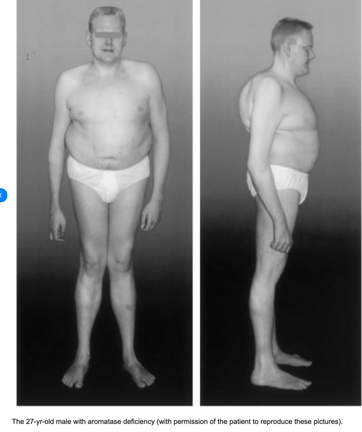 Even men need estrogen. Men with aromatase deficiency, a rare condition in which the enzyme that converts androgens into estrogen is absent or nonfunctional, develop a striking phenotype. They grow abnormally tall because estrogen is what closes the growth plates at the end of puberty, and without it, long bones just keep growing. They develop osteoporosis in their twenties. They get insulin resistance, fatty liver, abnormal lipid profiles, and early atherosclerosis. Their body proportions become eunuchoid, meaning disproportionately long limbs relative to the trunk. These men have plenty of testosterone. They are not lacking androgens. What they lack is estrogen, and their skeleton, metabolism, and cardiovascular system fall apart without it. When given transdermal estradiol replacement, their bone density increases, their epiphyses close, and their insulin resistance improves. This is published in the New England Journal of Medicine, documented across multiple case reports worldwide.