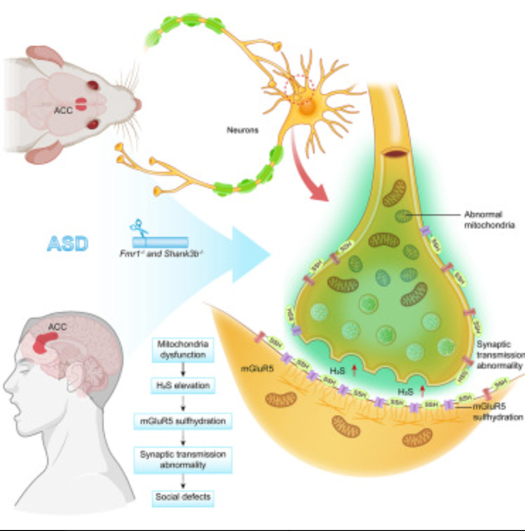 Researchers discovered that when neuronal mitochondria weaken, they release excess hydrogen sulfide (H₂S) - a signaling gas that, in high concentration, chemically alters synaptic proteins through sulfhydration. One target, mGluR5, a glutamate receptor critical for neuronal communication, becomes over-sulfhydrated and less responsive. Synapses misfire, social behaviors fade.