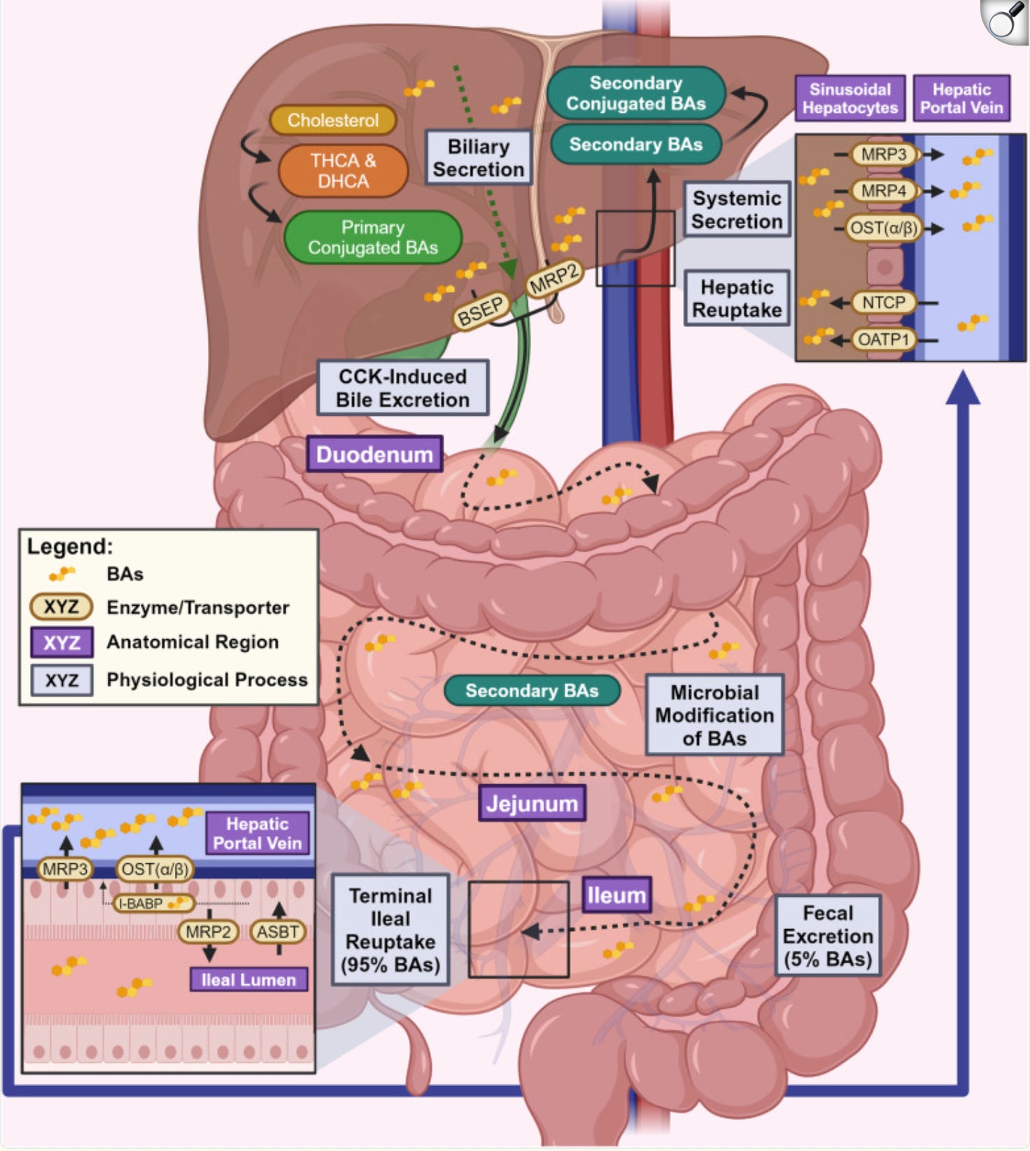 Physiological mechanisms behind BA enterohepatic circulation, maturation, and fecal excretion: Schematic diagram representation of the physiology behind BA enterohepatic circulation, maturation, and fecal excretion. BAs are synthesized in the liver and are excreted into the duodenum for maturation. Matured BAs may either be systemically reabsorbed or excreted in feces.