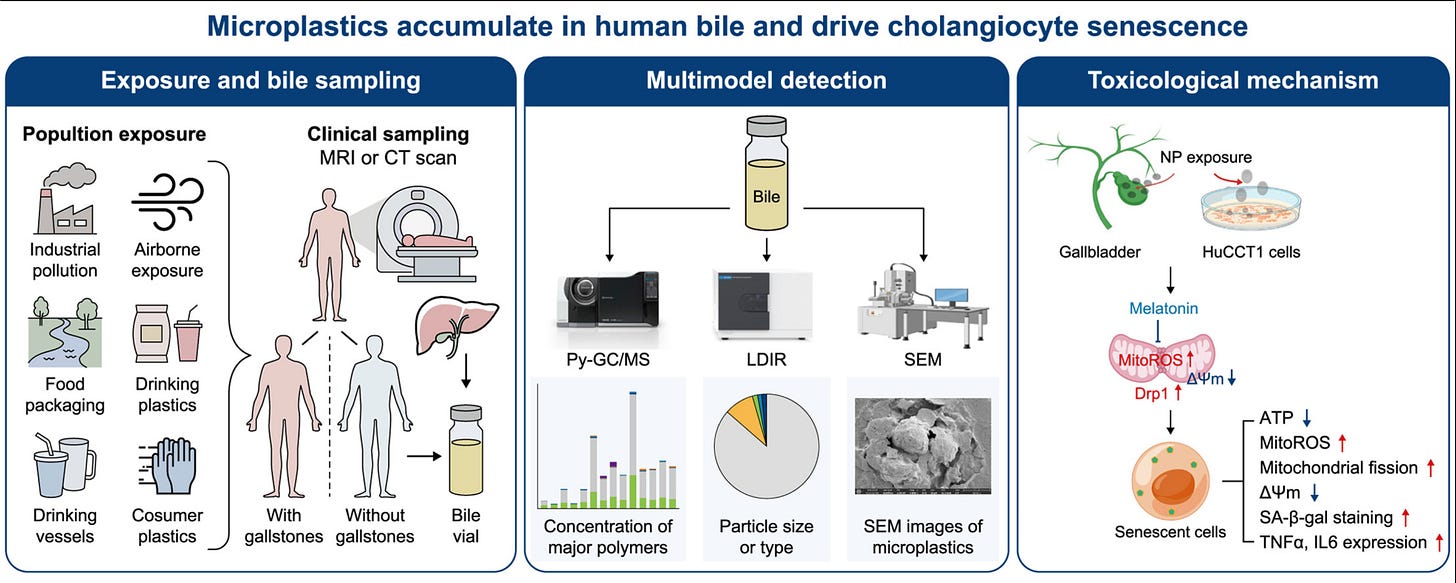 A 2026 study published in the journal Environmental Science and Ecotechnology found microplastics in every human bile sample they tested. Patients with gallstones carried roughly 3.7 times the microplastic burden of controls. The research team then showed that chronic low-dose nanoplastic exposure damages the cells lining the bile ducts through mitochondrial dysfunction and premature cellular aging.
