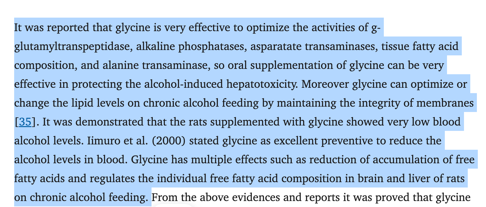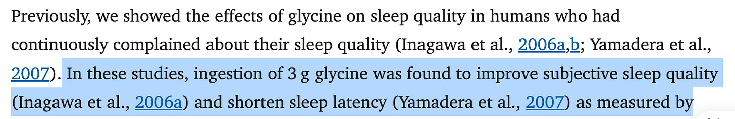 I’ve been taking 3 g of glycine before bed for about a month. I have struggled with poor sleep for years. I am amazed at the immediate improvement in my sleep quality and the ability to fall back to sleep after awakening during the night and no hangover in the morning! I have finally found my solution and highly recommend anyone try it that struggles with poor quality or quantity.