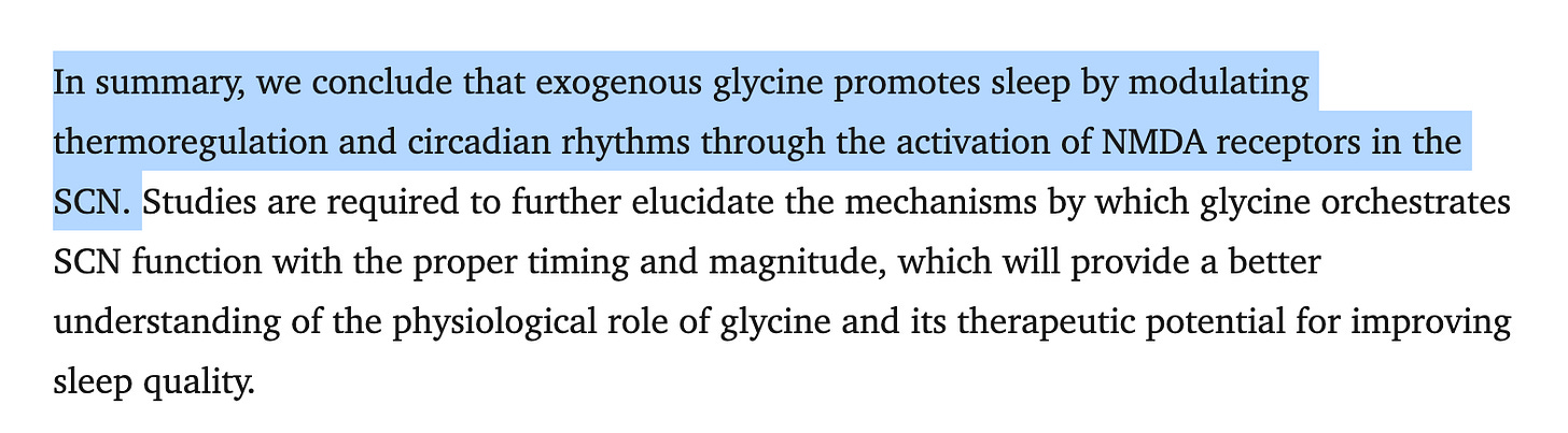 In mood and stress research, glycine was recently discovered as the key signaling molecule for a brain receptor tied directly to stress resilience and depression. This receptor sat unidentified for years — now we know it responds to glycine. (Martemyanov et al., 2023). This matches older clinical work (Heresco-Levy et al., 1999) where extremely high doses of glycine (60 grams per day) improved negative symptoms in treatment-resistant schizophrenia. Not because glycine is a drug, but because the nervous system is fundamentally dependent on inhibitory stability to offset glutamate-driven excitotoxicity. Glycine supplies the raw biochemical context for that stability.
